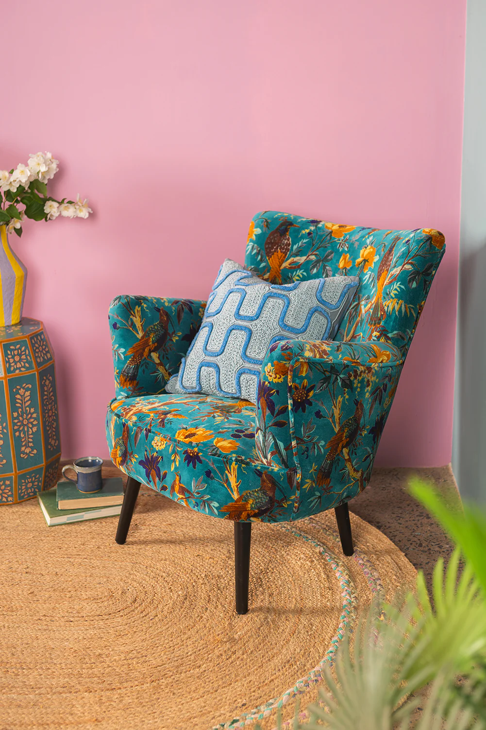 Our blue bird of paradise velvet armchair is bold and luxurious. The mango wood frame is upholstered in sumptuous blue velvet cotton fabric that has been printed using hand screen-printing techniques to create our beloved bird of paradise design. This gorgeous, shapely armchair is finished with dark coloured legs for a seat that will easily enhance most interior styles.