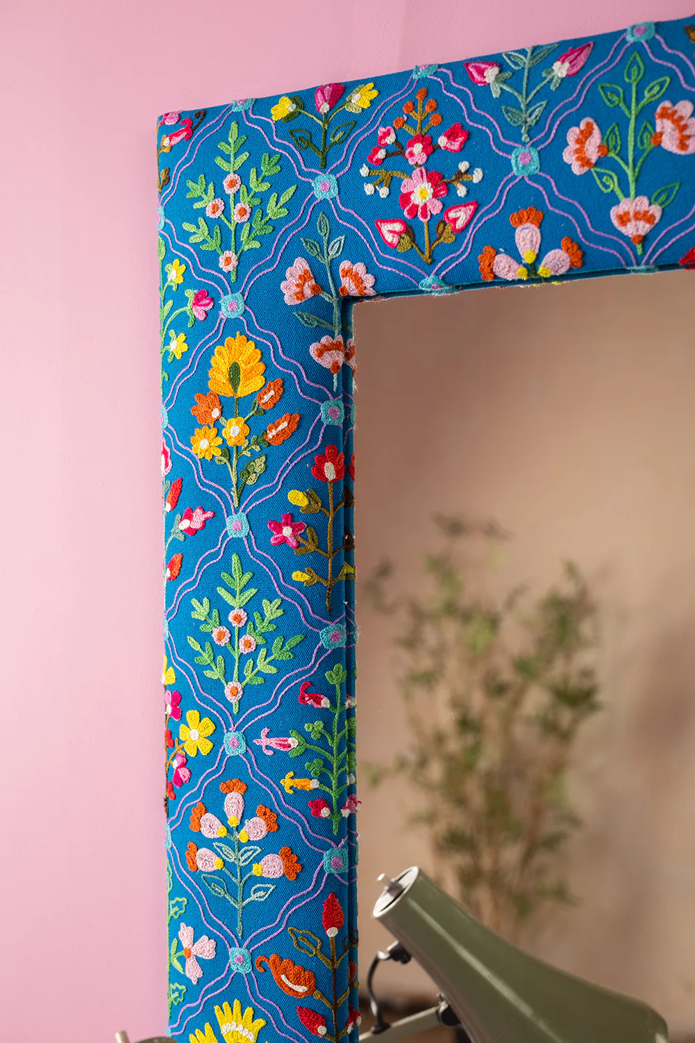 Delicate and floral, our wood framed wall mirror has been covered with beautiful blue cotton fabric and then embroidered with fine flower patterns and motifs. Brighten up any wall space in your home with this mirror that is sure to make you smile.Â