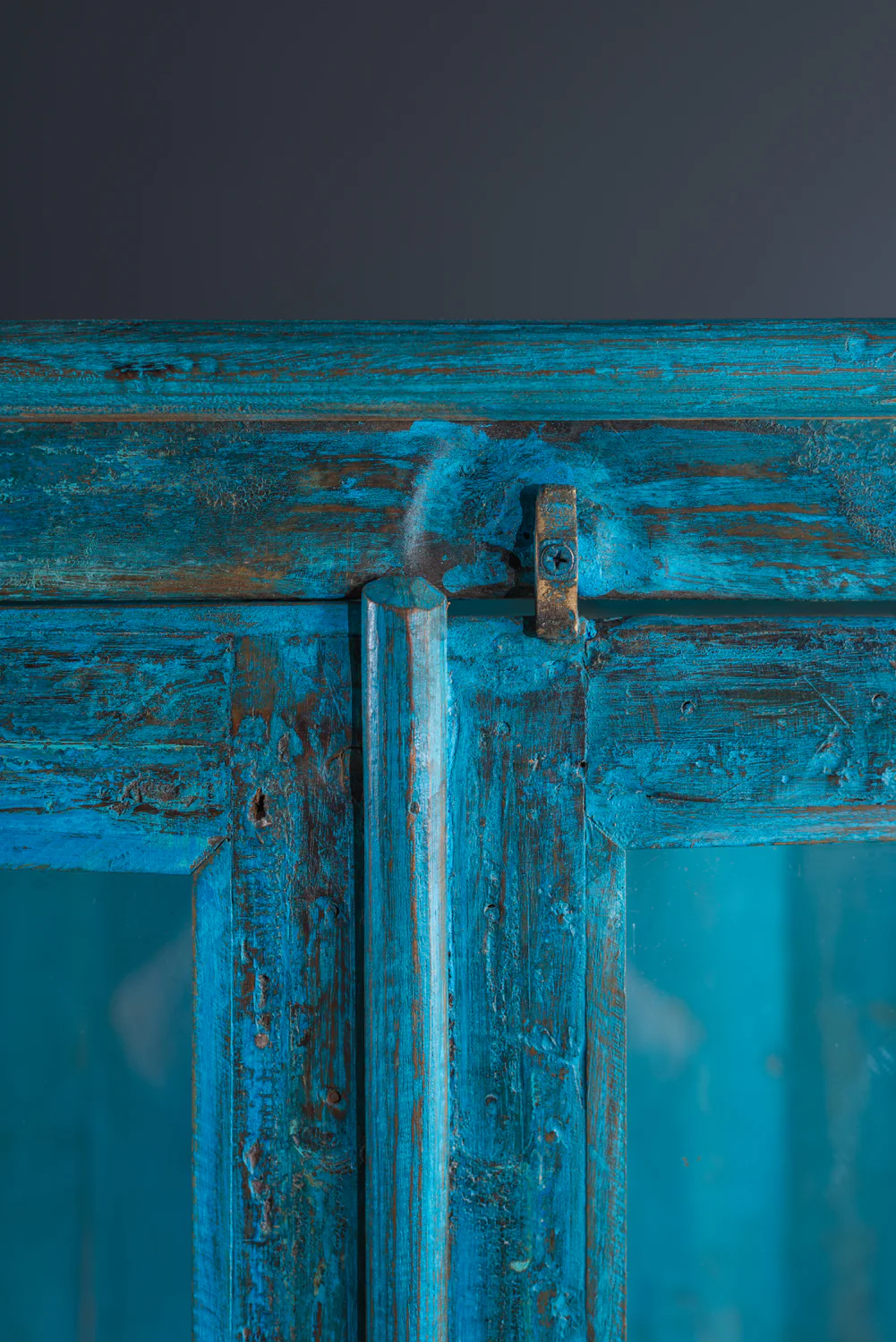 Our vintage wooden cabinet is a great piece for both display and storage. Two doors featuring both glazed and solid panels open onto a shelved interior. Glazed panels on the sides create a cabinet with a top section perfect for display and a lower section ideal for storage. Bright blue paintwork inside and out give this piece a lively, vibrant feel that is sure to lift any space. Â