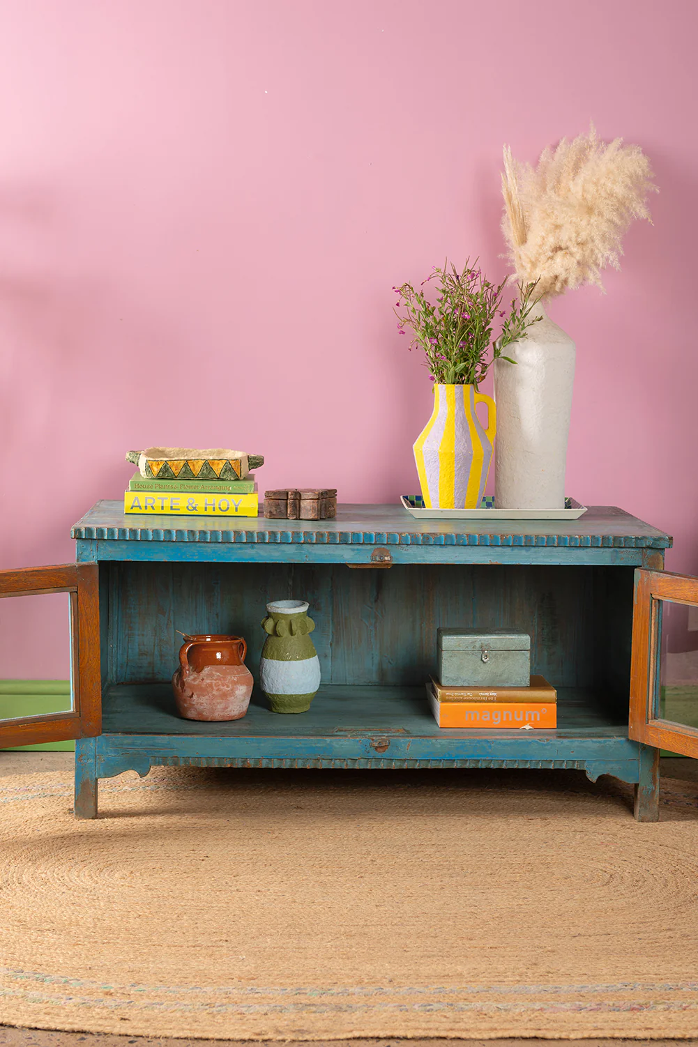 Our low blue vintage wooden cabinet is an ideal piece for smaller spaces. Two glazed doors open onto generous space making this piece great for display. Distressed blue paintwork, carved and shaped wood details, and a little natural wood, come together to create an elegant piece that will lift any space.