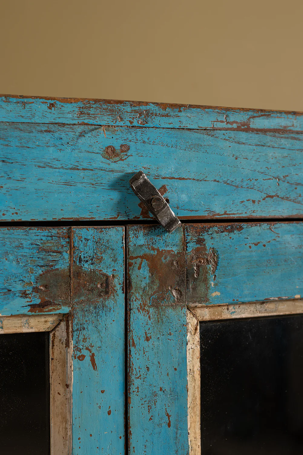 This vintage wooden cabinet features four glazed doors opening onto generous cupboard space making this piece perfect for storage or display. The distressed light blue paintwork pairs beautifully with the natural wood of the interior for an easy going look. Finished with white highlighting and simple styling, this cabinet makes for a great addition to a lounge, dining area or hallway.