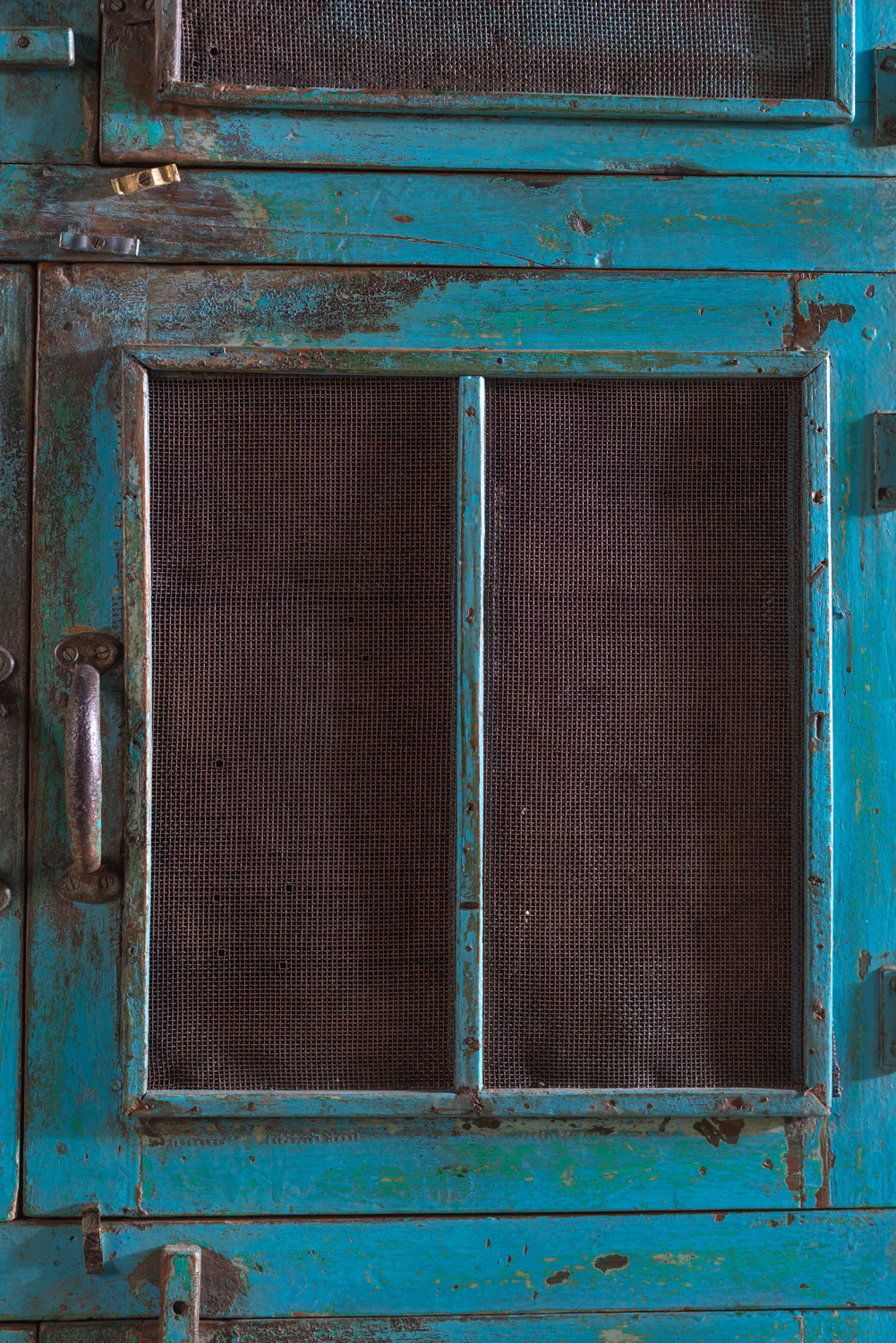 This impressive vintage wooden cupboard features six doors with mesh panels which open onto generous cupboard space and shelving. The bright blue paintwork is complimented by the natural wood of the interior. Metal fixings, mesh panels and striking styling give this cupboard an industrial feel enhanced by vintage character.