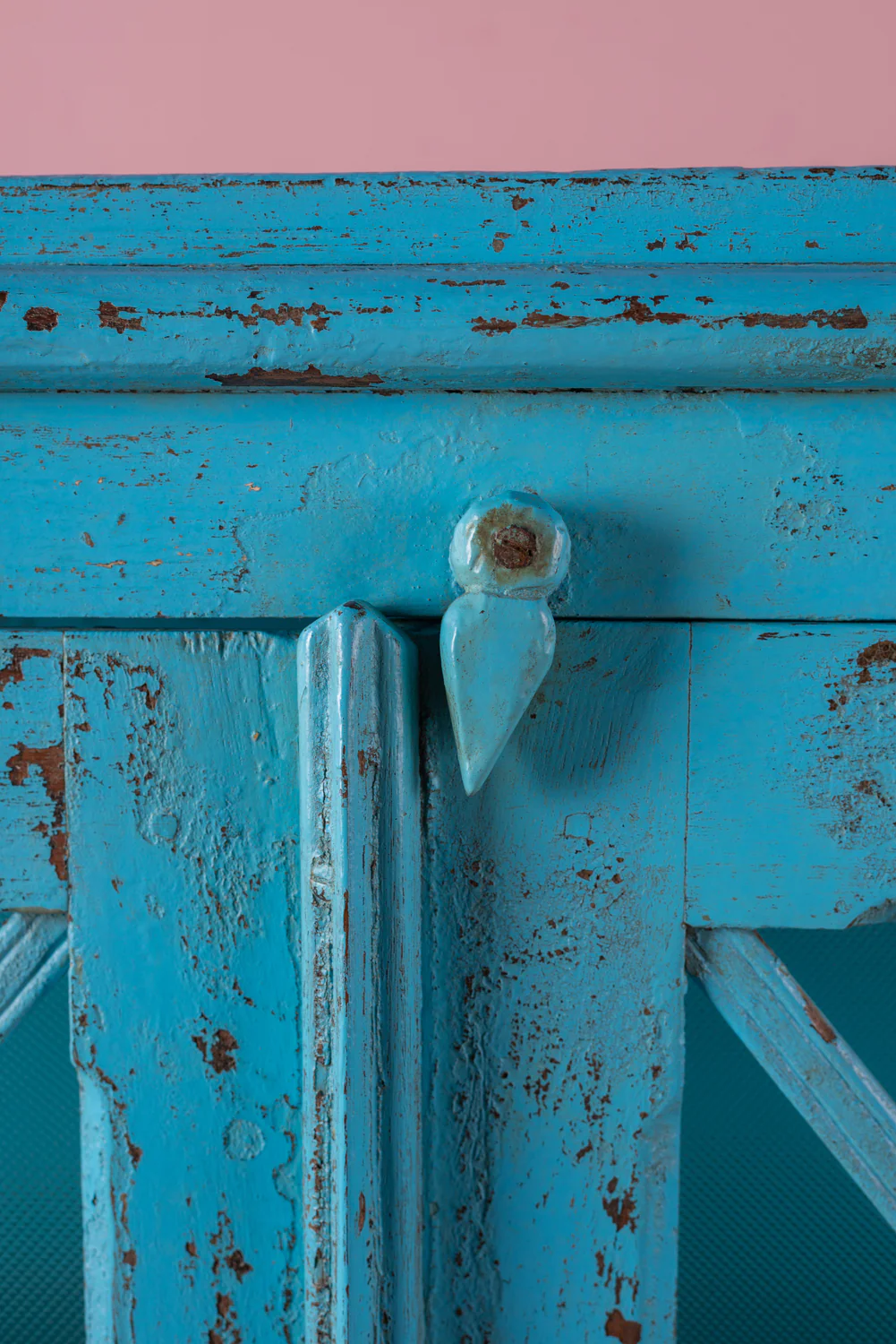 A vintage wooden cabinet with a difference. This piece is a soft blue colour inside and out with two doors and a shelved interior. The doors and sides have been glazed with panels of textured glass and wood decoration for an unique look. The opacity of the glass panels make this piece ideal for storage whilst retaining the elegant quality of a glazed cabinet.