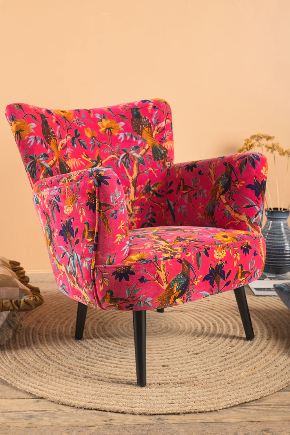 Our cerise pink bird of paradise velvet armchair is vibrant and luxurious. The mango wood frame is upholstered in sumptuous cerise velvet cotton fabric that has been printed using hand screen-printing techniques to create our beloved bird of paradise design. This gorgeous, shapely armchair is finished with dark coloured legs for a seat that will effortlessly brighten up any space in your home.