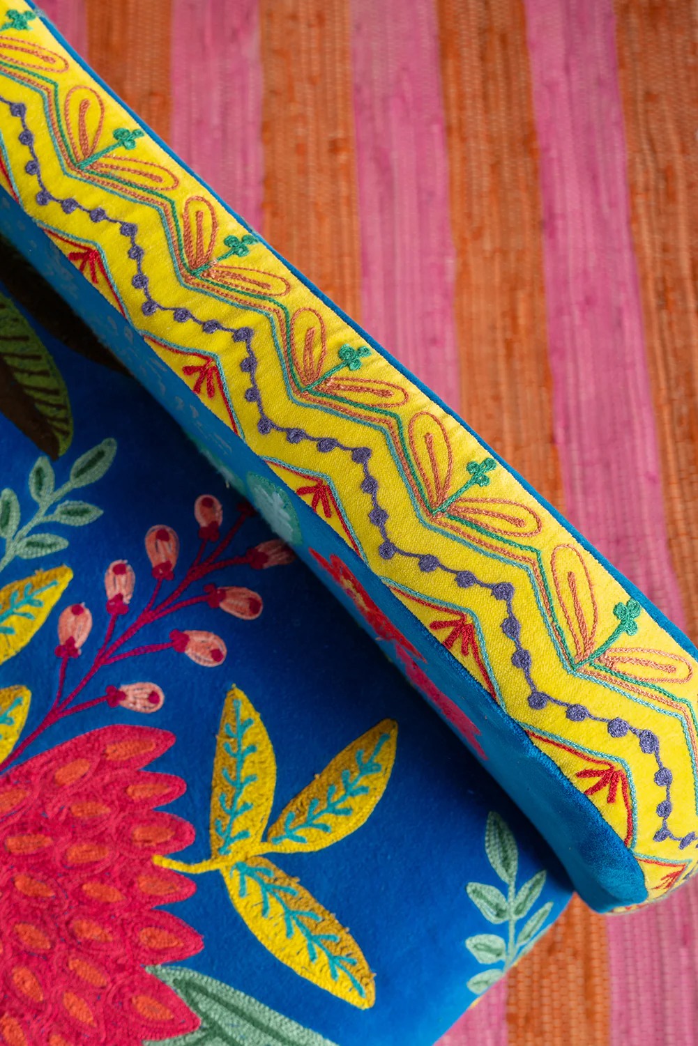 The Cholena embroidered armchair is a meeting of bold colour and delicate design. The mango wood frame is upholstered in vibrant royal blue fabric that has been embroidered with glorious floral crewel work. The blue is broken up with yellow edging and light wood colour legs for an exceptional armchair that is as much a spectacle to look at as to sit in.