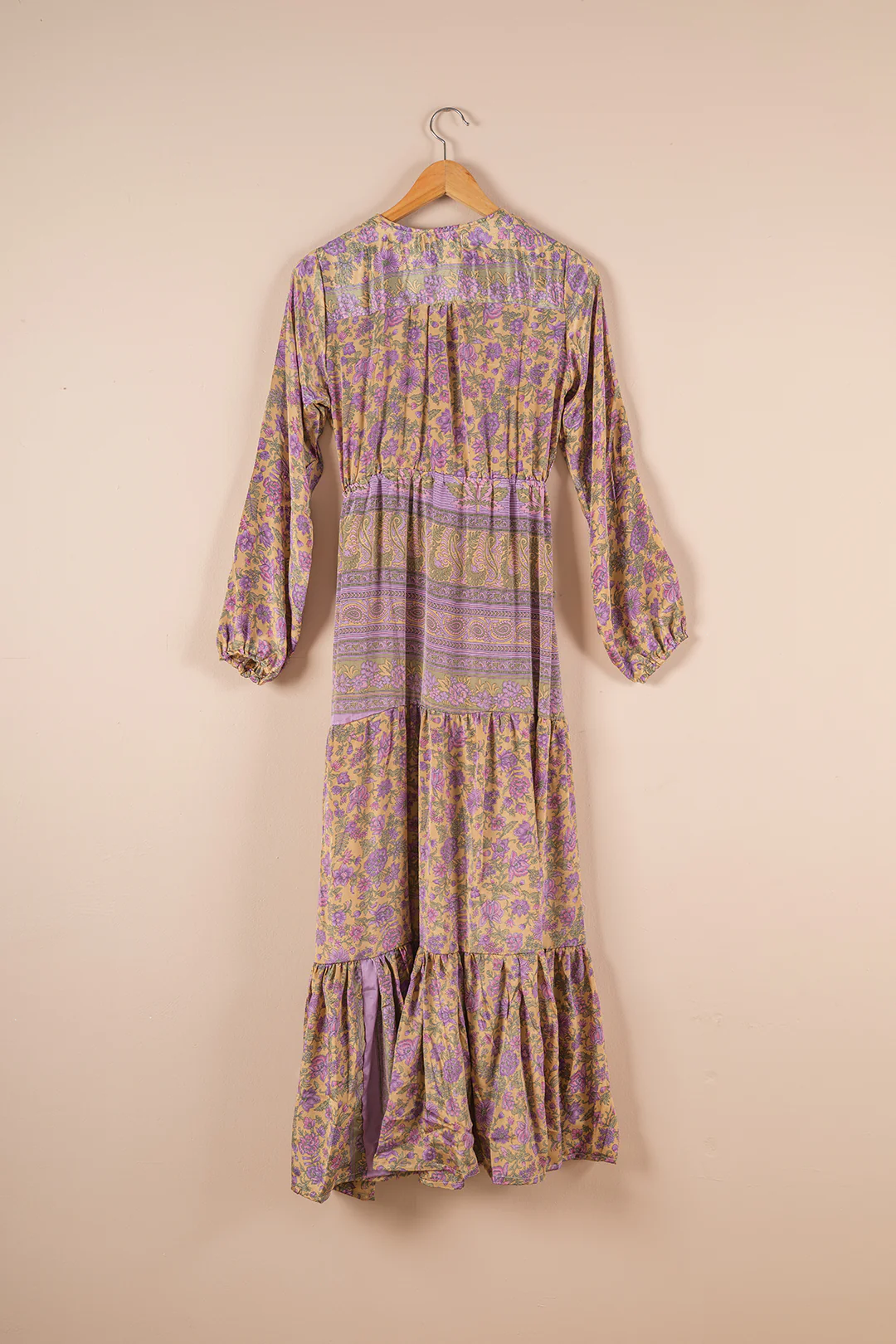Flowy, opulent and colourful. Our long dresses have been made from recycled silk saris, pieced together to create a lustrous garment that can be dressed up or down with ease. The long sleeves and long skirt are softened by a V-shape neckline. Cinch the tie at the waist for a flattering silhouette. The recycled sari material showcases spectacular colour and design; some pairings are beautifully complementary, some are wildly striking! Find your personality in one or our unique recycled silk dresses.Â