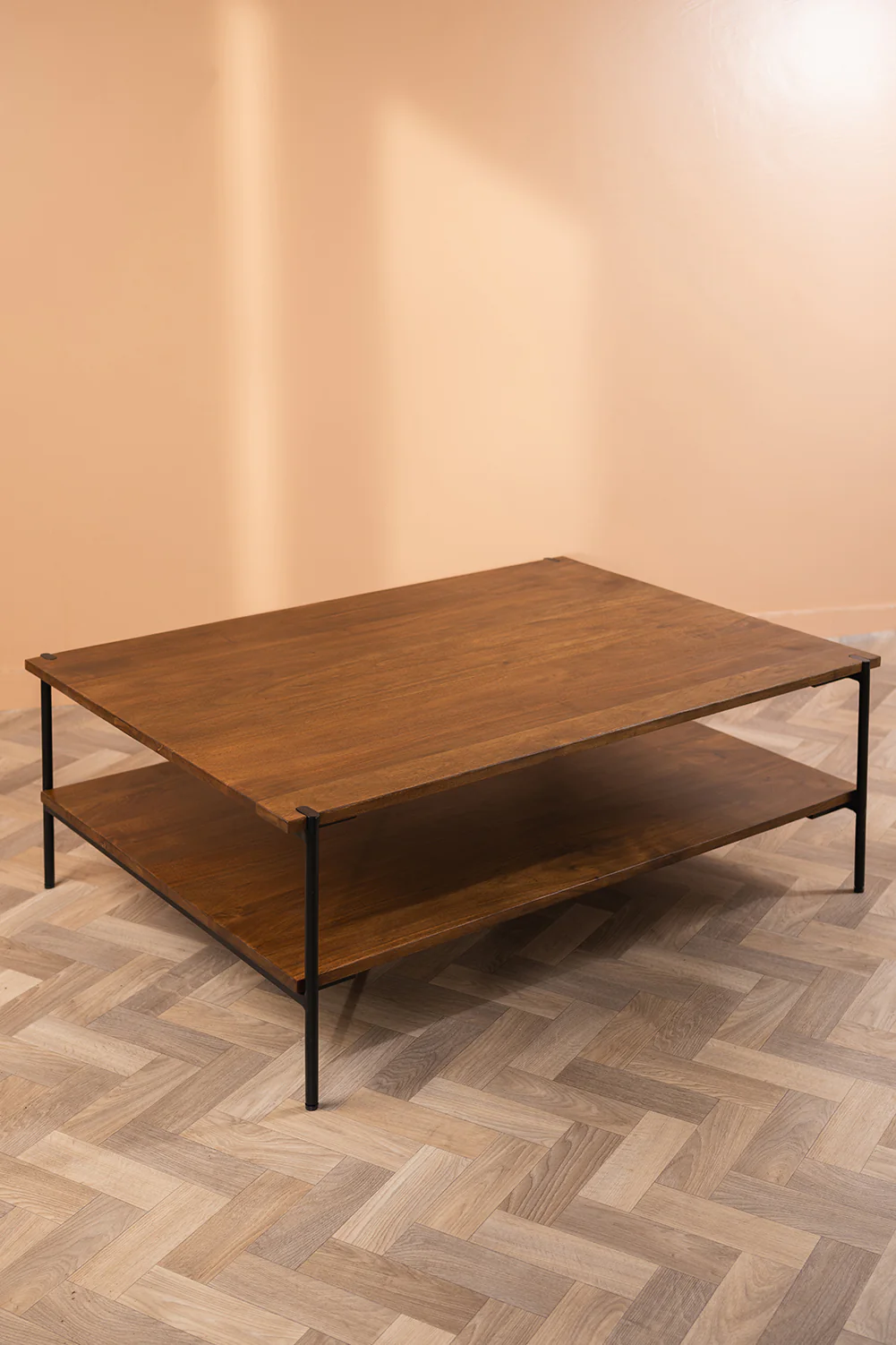 Minimalist design and a meeting of materials create a coffee table that is as attractive as it is understated. This piece is a sophisticated table with an additional shelf beneath the table top giving that endlessly useful extra bit of storage space. Made from acacia wood, this dense hardwood is durable and resilient, and renowned for its wonderfully varied range of natural grains. Black metal and the deep umber brown finish work with the wood grain for a deeply rich look that will elevate your space while embracing functionality.