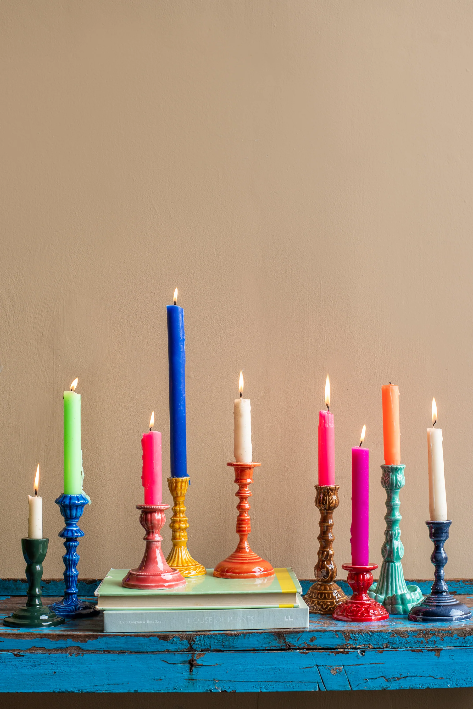 These colourful moulded candle holders are a gorgeous tableware addition. These candle holders are made to mix and match with other colours and sizes, so create your own perfect dining centre piece. Made from cast metal and coated with a glossy ceramic finish.