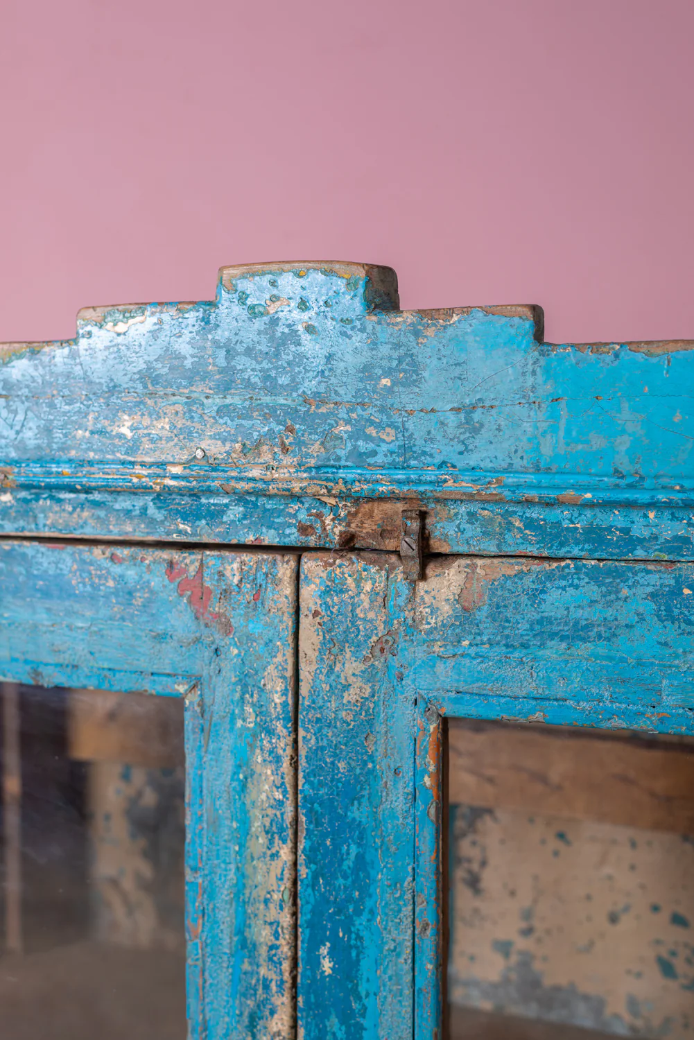 Our blue vintage cabinet is perfect for display with its two glazed doors, glazed sides and shelved interior. The distressed blue paintwork works beautifully with the cream colour inside, and with the shaped wood top edge, this piece is full of character. An elegant addition to a lounge or dining space for displaying your treasures and ornaments.