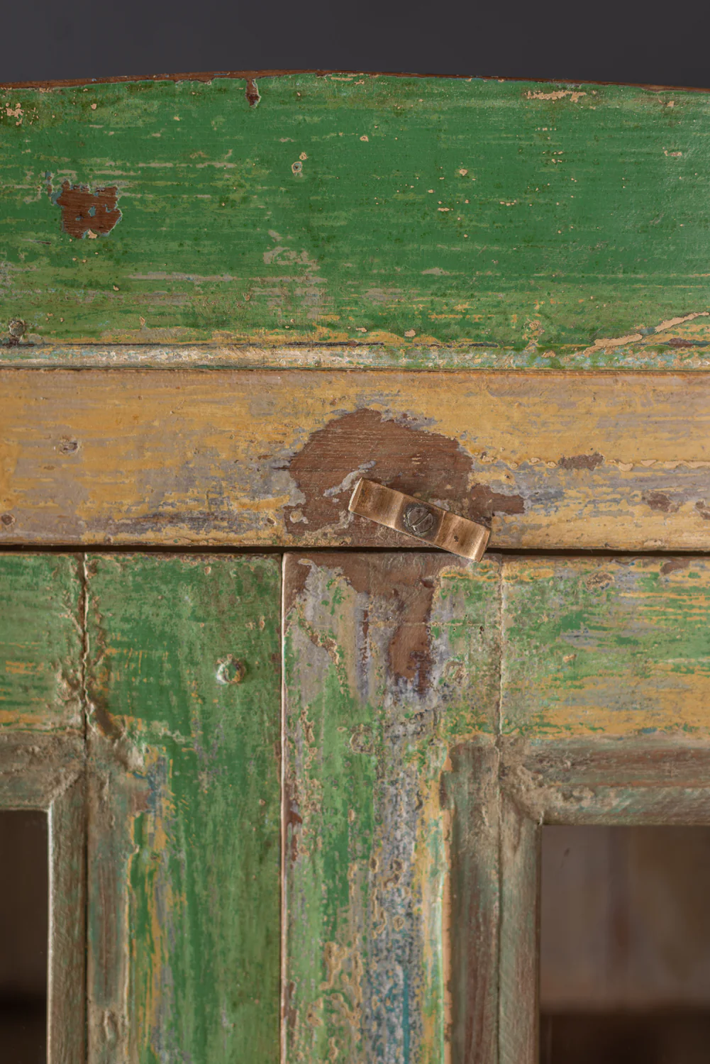 This wooden vintage cabinet features four glazed doors that open onto a cream coloured shelved interior. The highly distressed green and yellow paintwork gives this cabinet a wonderful earthy, homely feel. A great piece for storage and display, this cabinet is ideal for a kitchen, lounge or dining space.