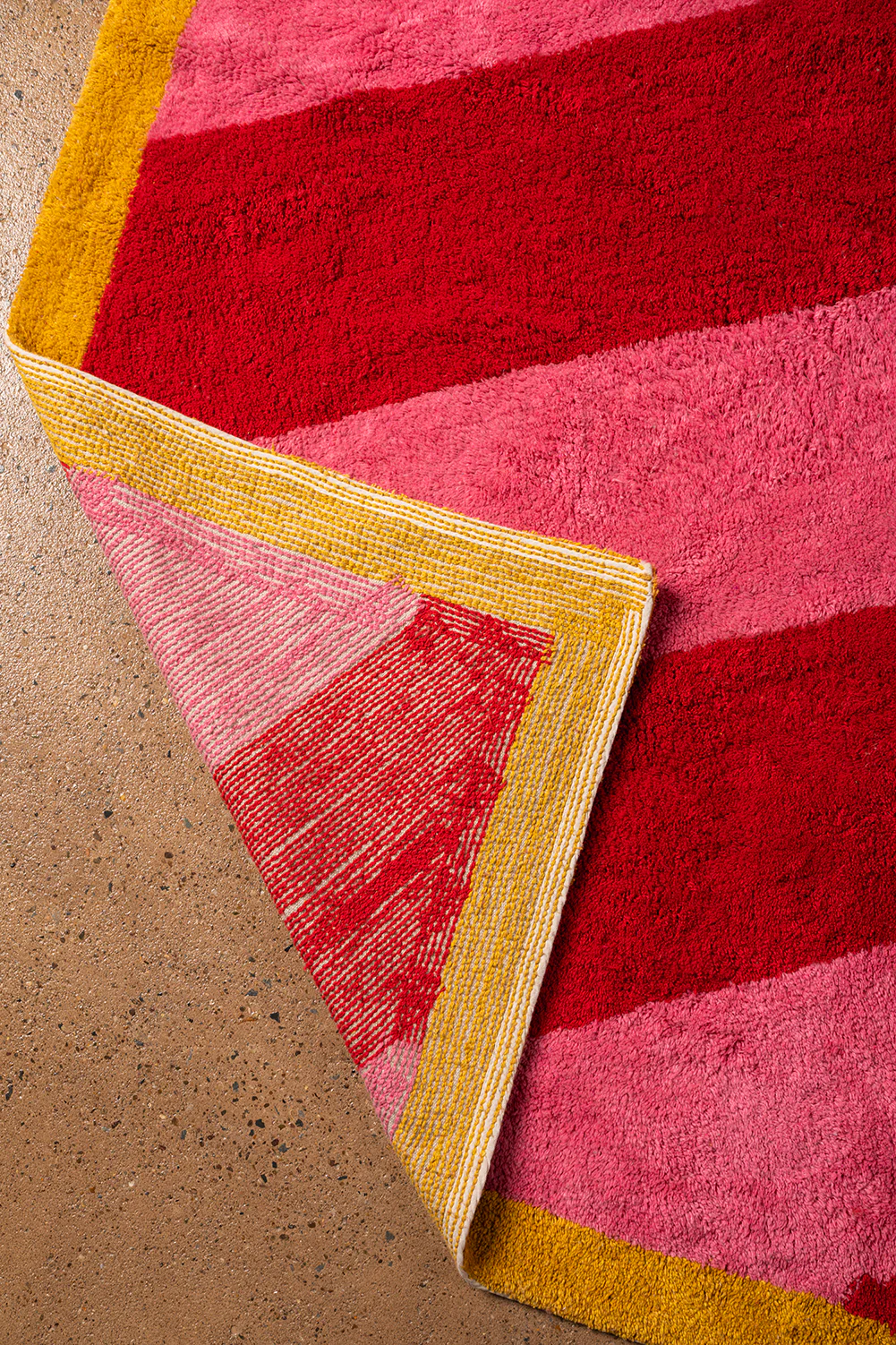 Striking, fun, modern. Our Flossie rug; part of our soft-backed, tufted rug collection, brings to mind fairgrounds and circus tops with bold diagonal stripes and a bright border. Decadent red alternates with baby pink; bordered in a vibrant mustard yellow colour. Whimsical colour combinations and chunky design make the Flossie a standout rug that is available in three different sizes to best fit your space.