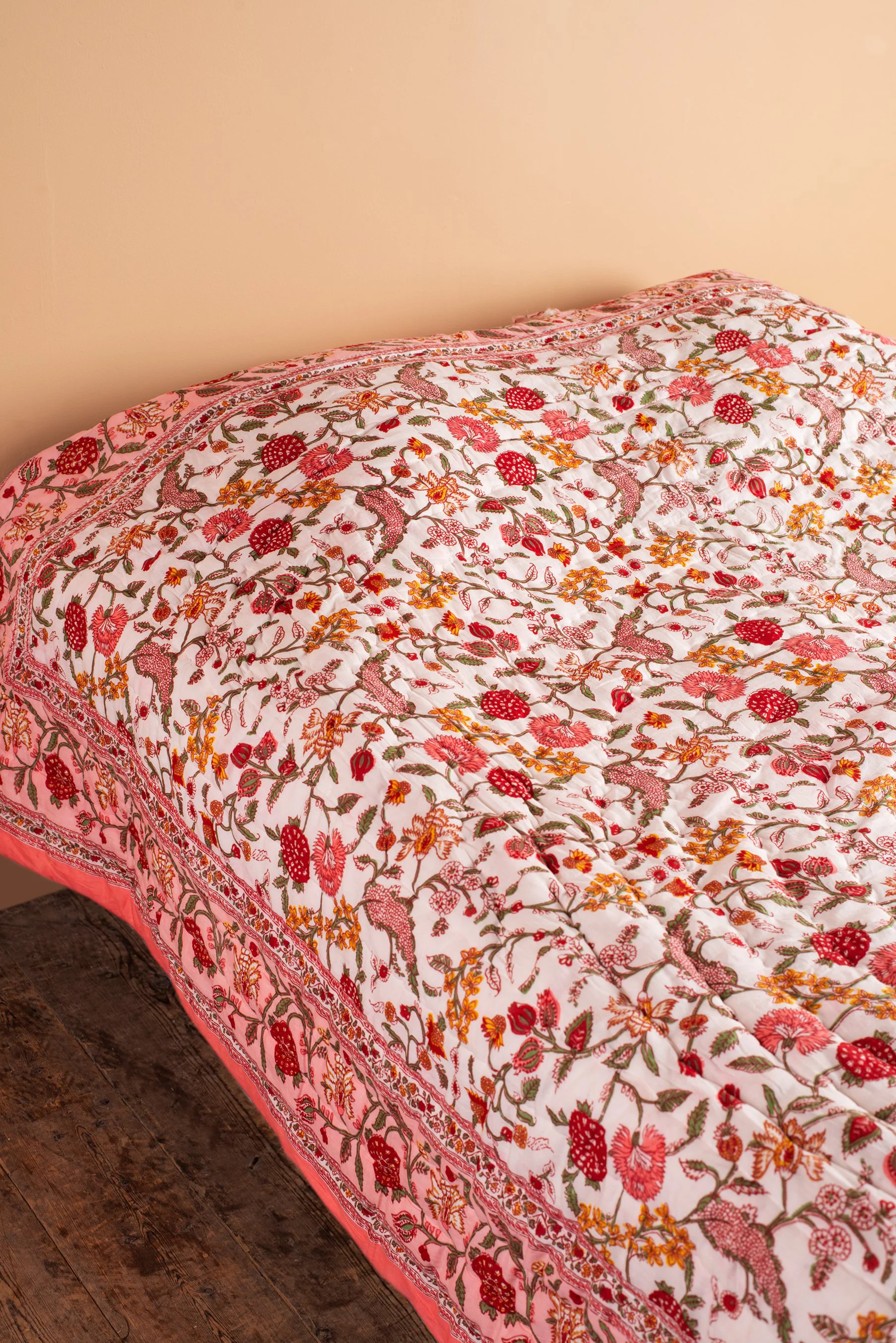 The coral haze quilt features some beautiful tones to compliment the changing seasons, and is fully reversible. From the pumpkin yellow highlights to the salmon pink petals and tomato red flowers, this screen printed quilt will be your go to throughout the year.