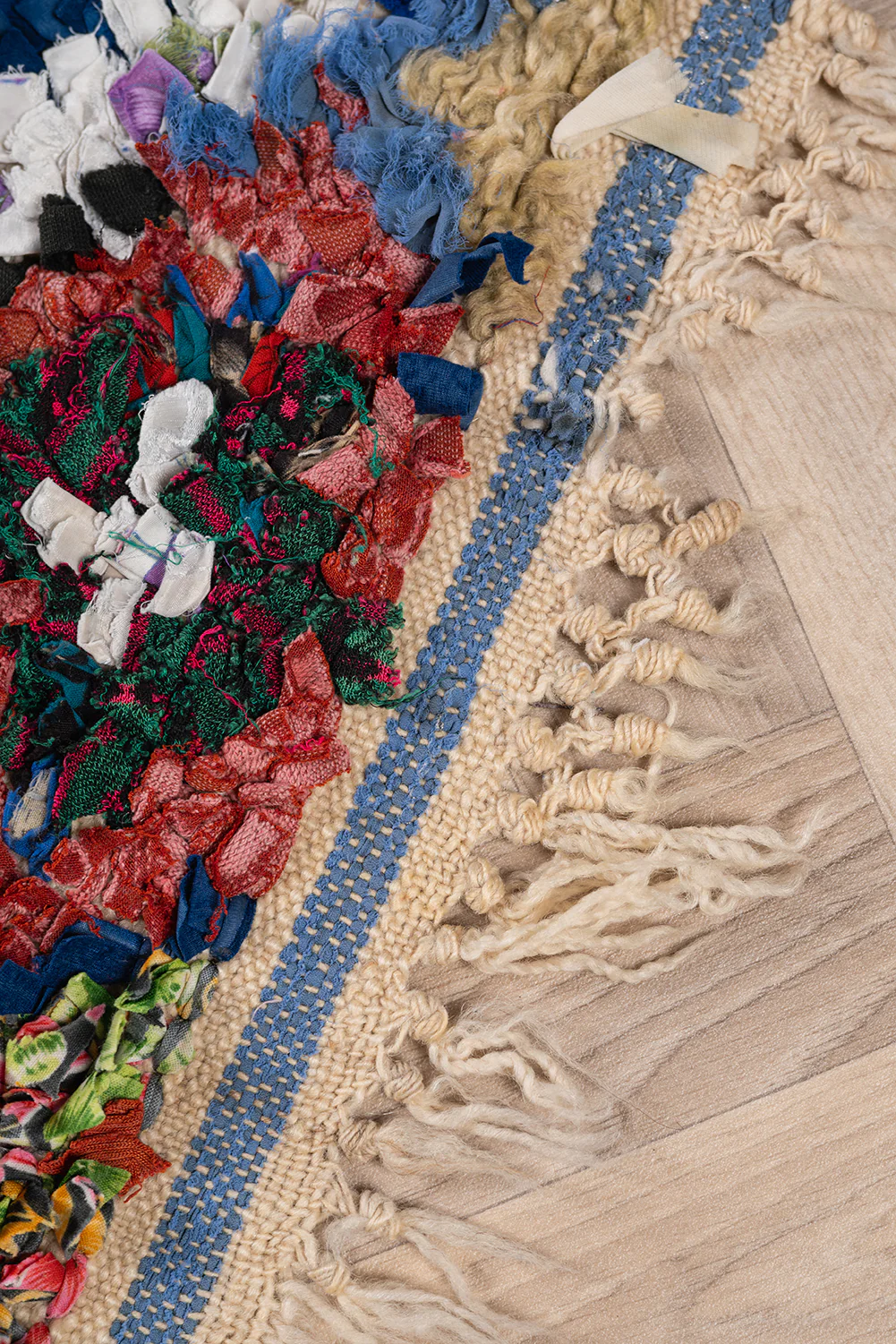 'Boucherouite', means 'a piece torn from old clothing' in Arabic. This vibrant, colourful rug has been created using small pieces of scrap fabric.