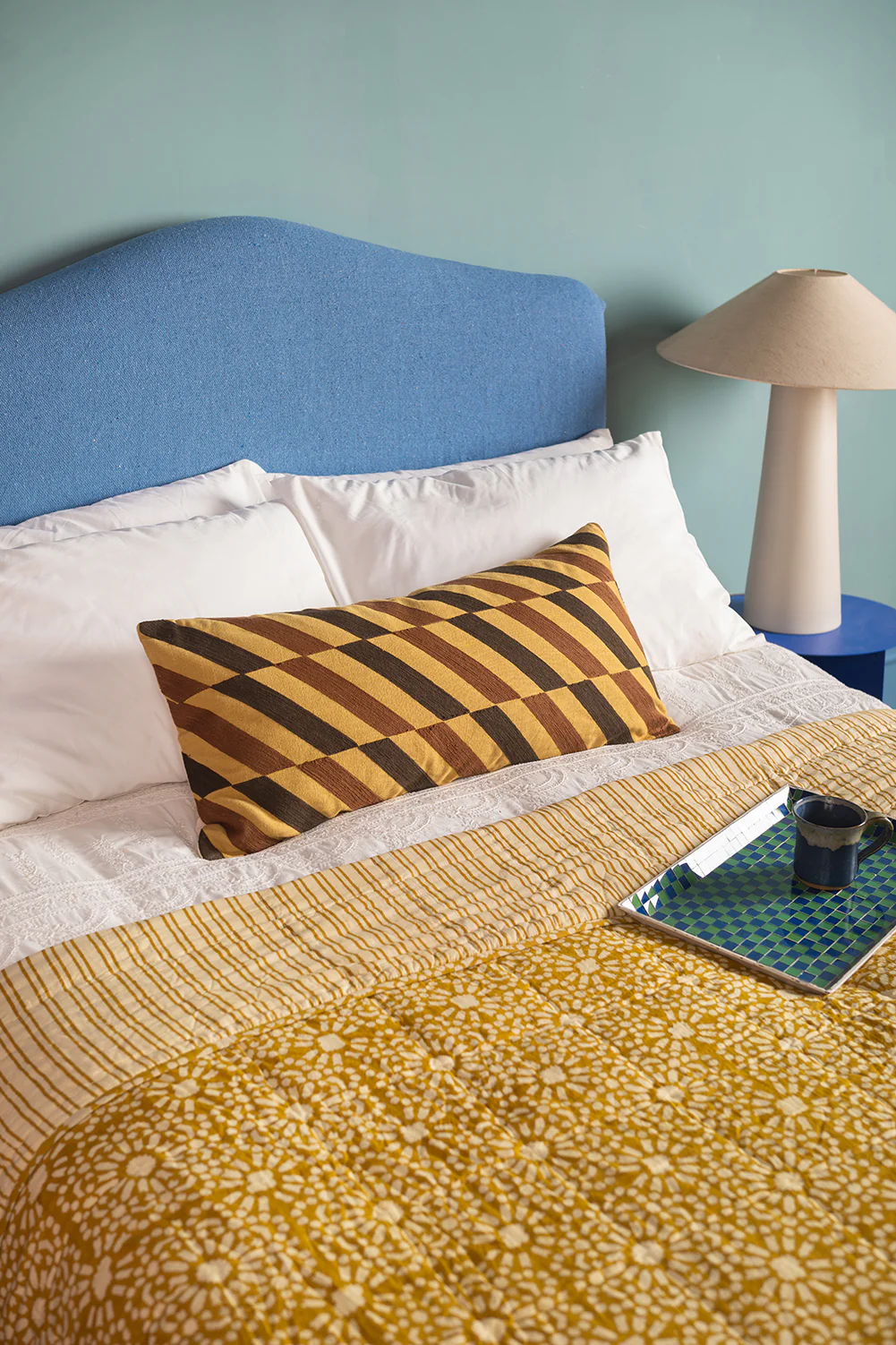 Modern design meets a retro colour scheme in this slender embroidered cushion. Staggered diagonal stripes in rich brown tones have been beautifully embroidered onto a deep mustard yellow background creating a high contrast, geometric design. Eclectic and eye catching, this cushion has been finished with a natural coloured backing. Create a look to be remembered with this striking cushion.