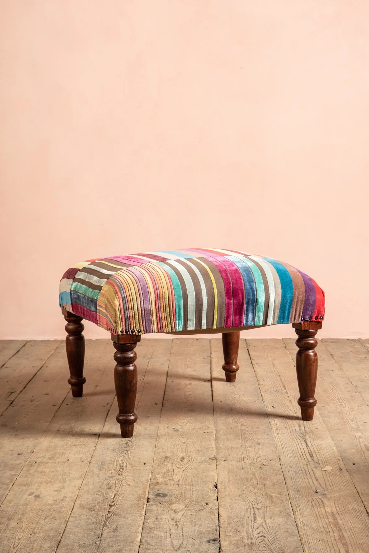 The plethora of vibrant colours within the soft cotton velvet stripes make this popular footstool a statement in any room. These footstools are handmade to fair trade standards and so each one is subtly different. This truly unique footstool is certain to bring your room alive.