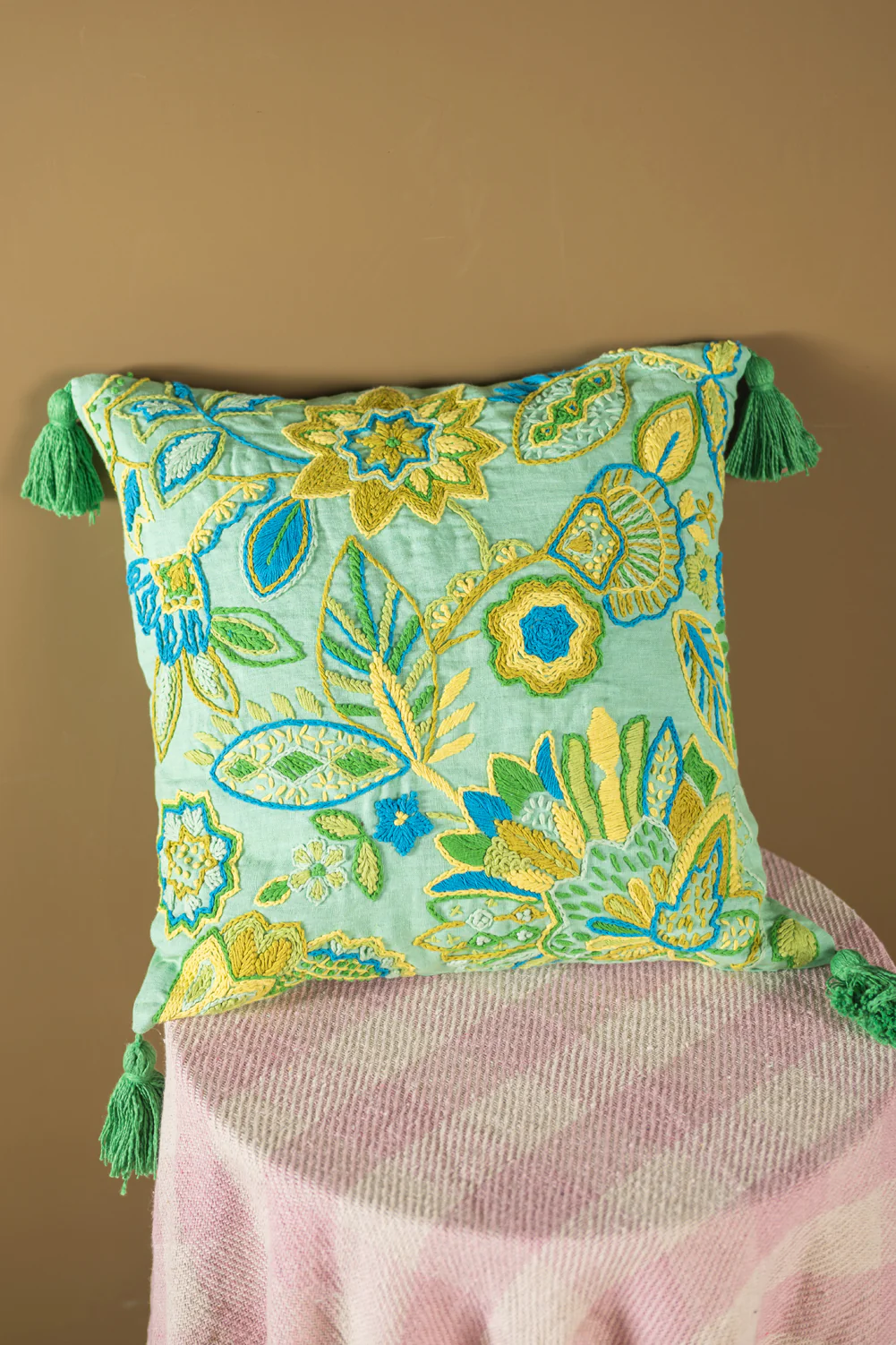 A wildflower meadow of blues, greens and yellows has been created with a crochet-like embroidery on a turquoise coloured linen background. Lively and textural, this cushion is finished with green coloured tassels on each corner. A vibrant and striking addition to a neutral interior.