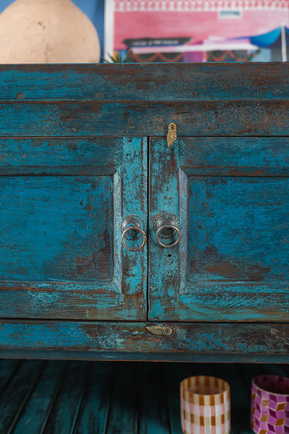 This deep blue vintage piece is part cabinet, part shelves. The top section is a cupboard with two doors opening onto a generous matching blue interior, with a wood top edge. Below this are two spacious shelves with slatted sides. The distressed blue paintwork and traditional styling create a characterful look that will easily blend with most interior styles.Â