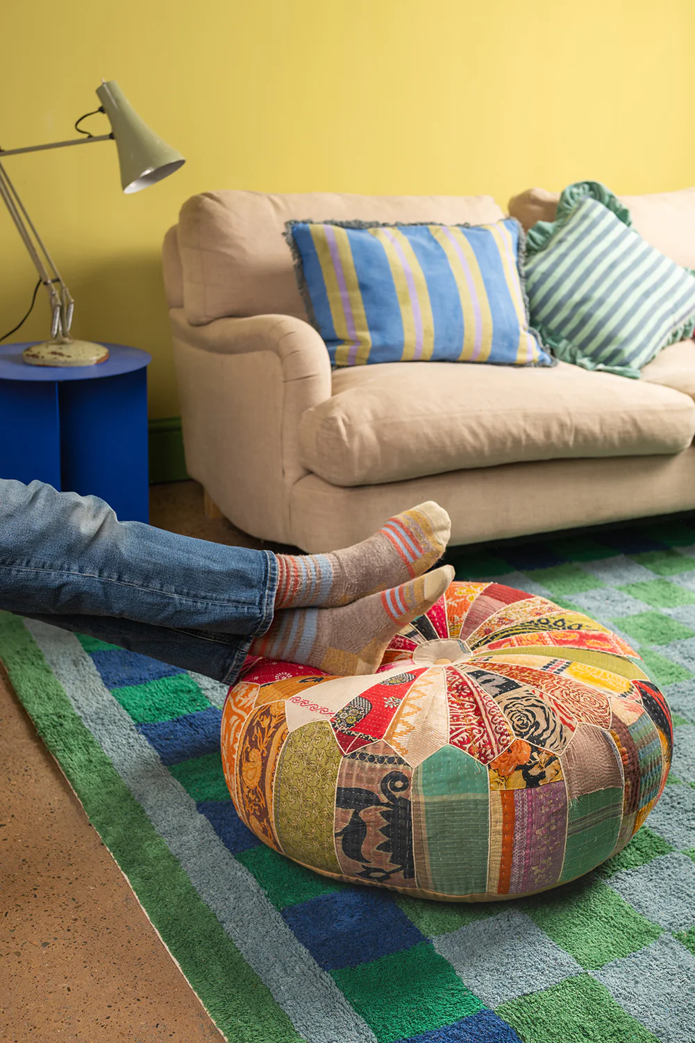Fantastic gudri work (running stitch) vintage fabrics in this patchwork pumpkin pouffe, each one is different and unique; a stand out item. Â