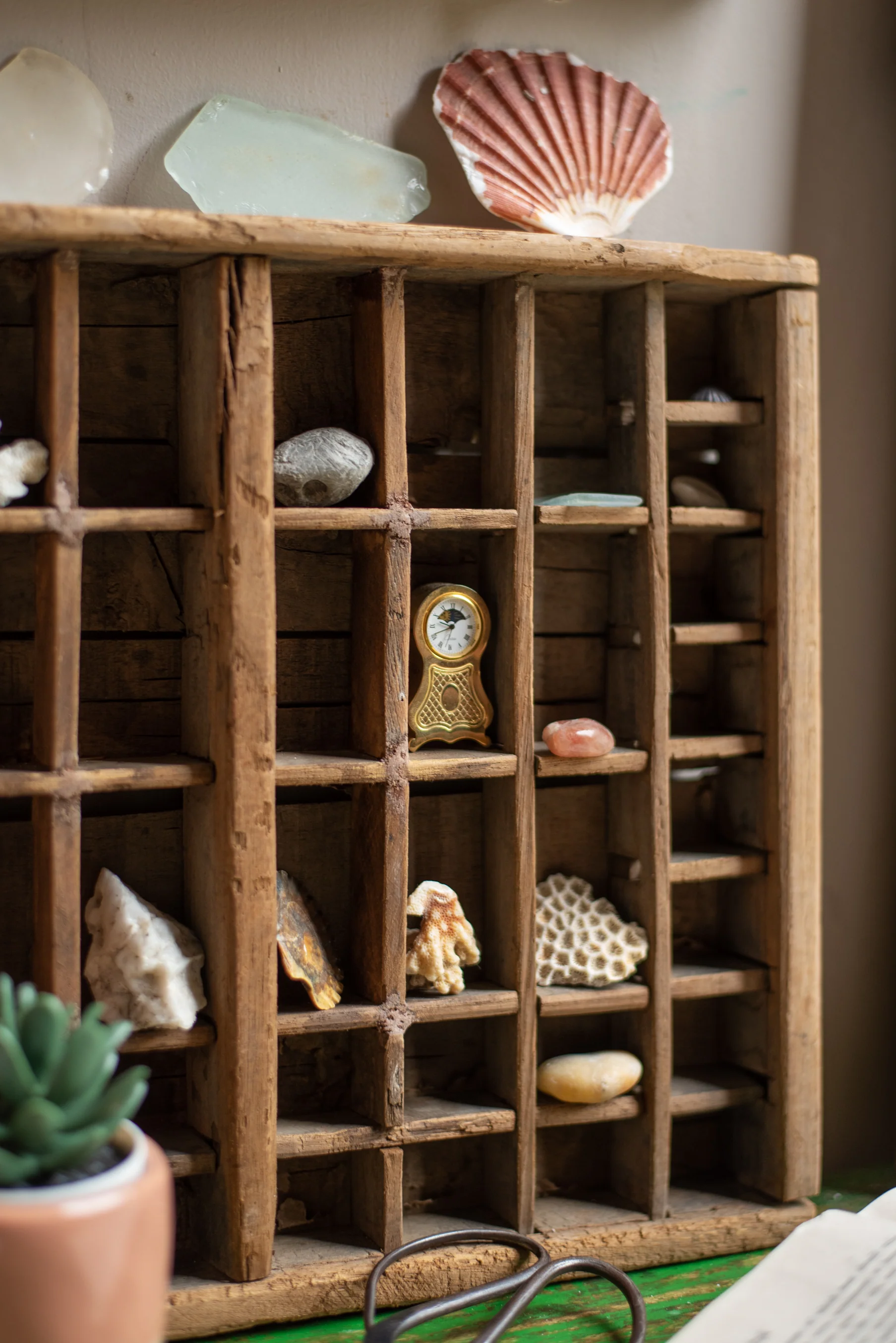 Long before computers and smart phones, the main line of communication was through paper. These were printed by machine, but not before the pages were painstakingly laid out backwards with block letters with which to print from. Letters, or typeface, were kept in cases and here is a lovely example. It is vintage and very well constructed (as metal type is heavy) and is where the term ‘upper case’ for capital letters derives. Perfect for displaying knick-knacks and indeed small printing blocks.