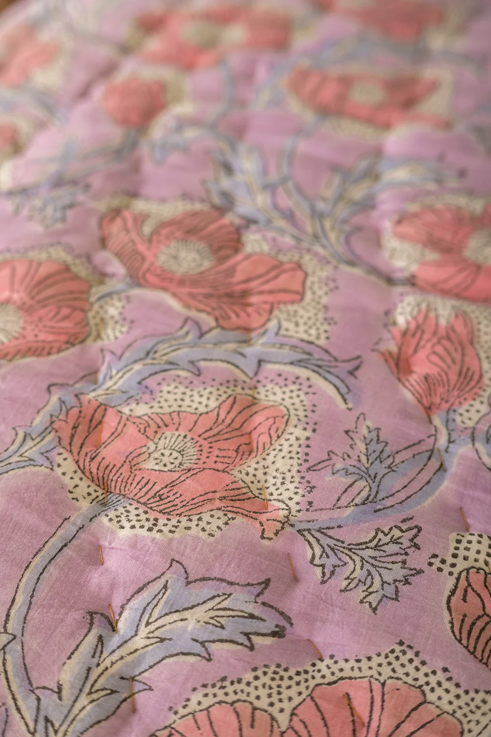 Apricot & Lavender, screen printed double sided quilt with a bright floral design.