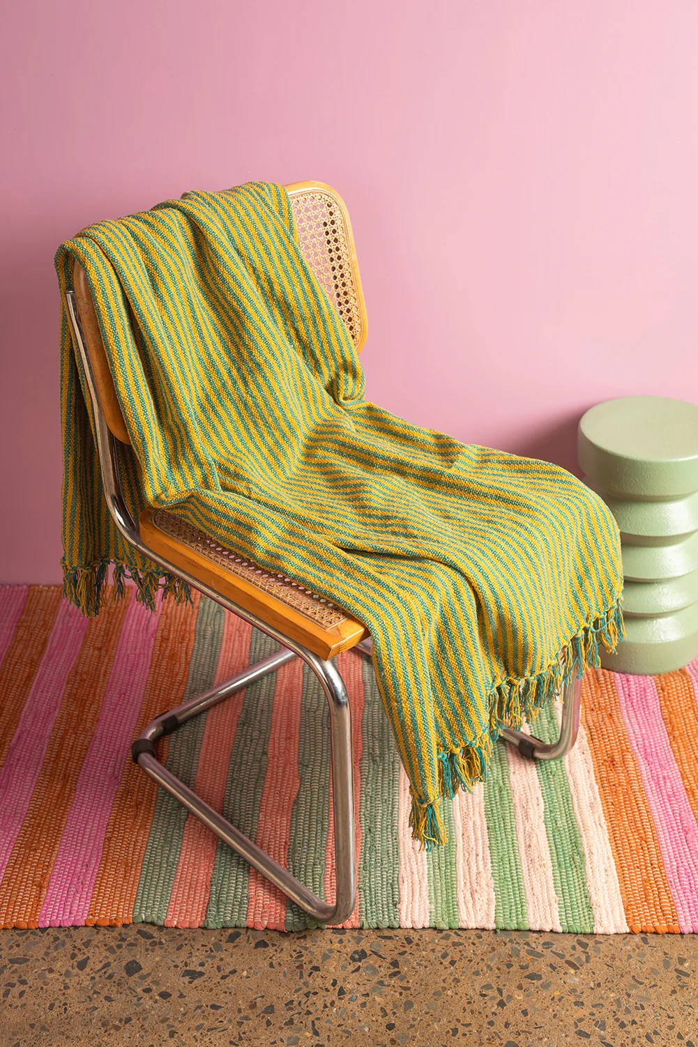 Combine comfort and colour with our gorgeous throws featuring playful colour combinations, soft texture and tasselled fringes. This yellow and green striped throw is made from 80% recycled cotton so you can be conscientious as well as cosy. Liven up furnishings, wrap up of an evening, and add a pop of colour to your room.Â